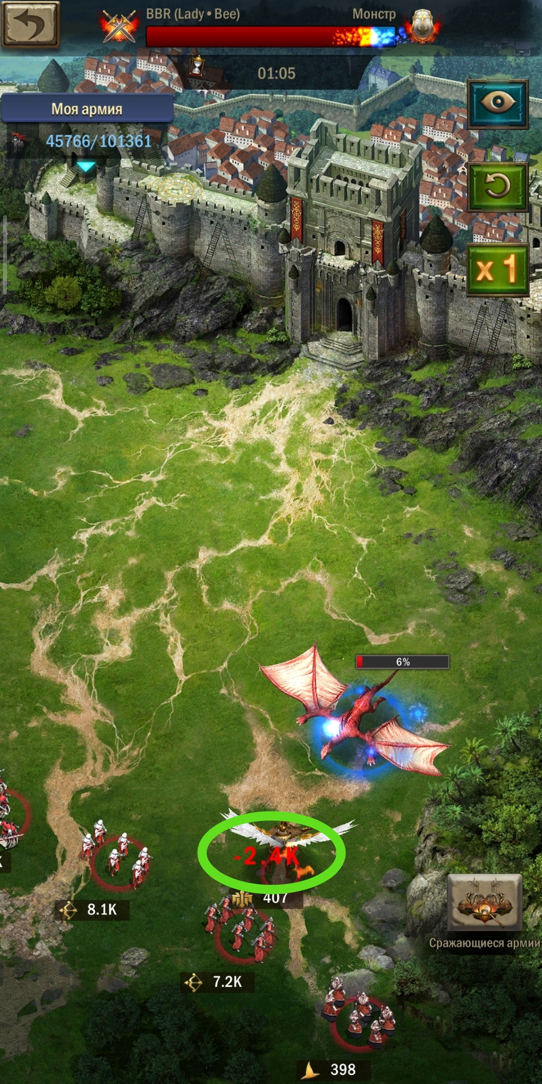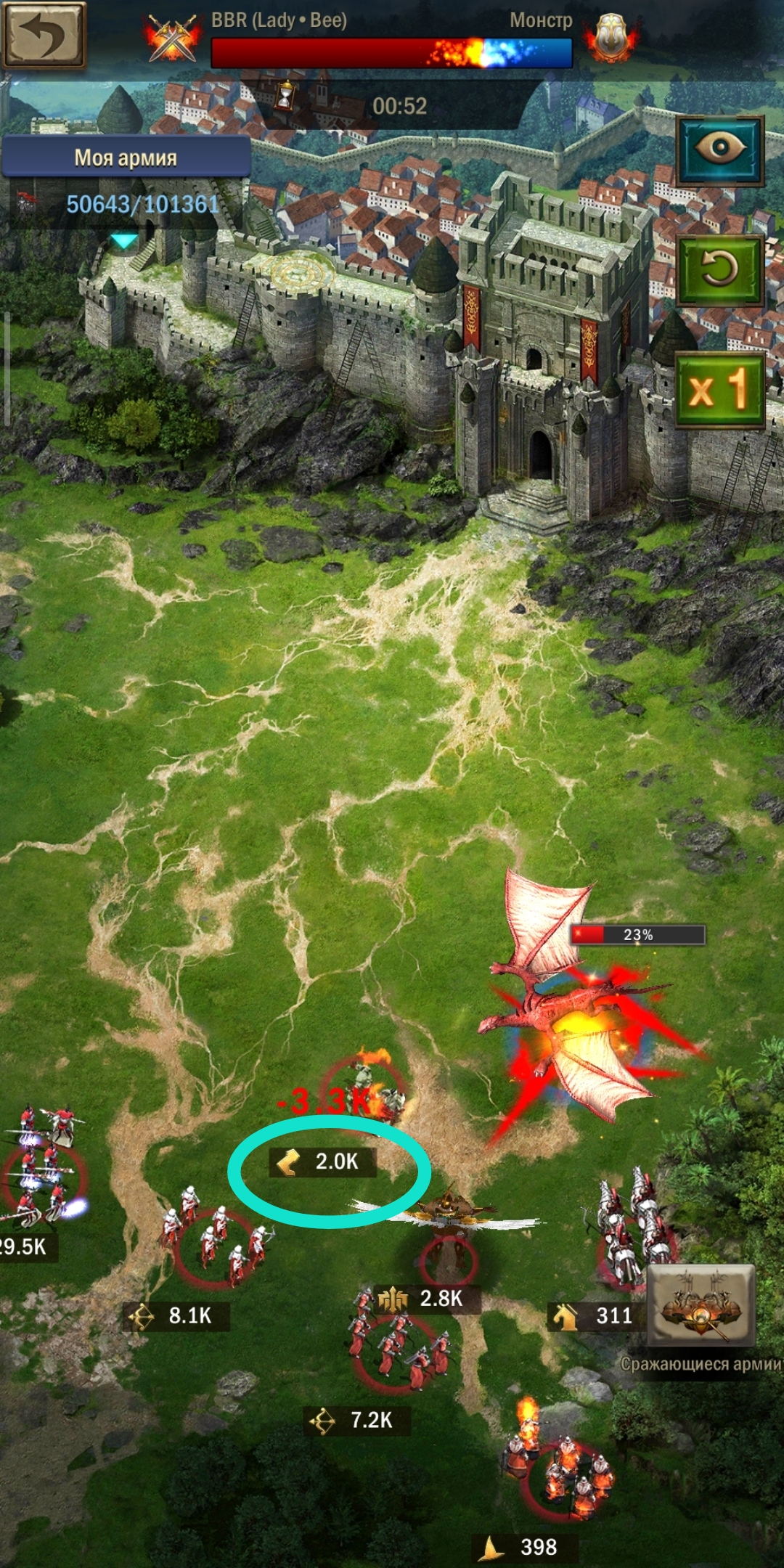 Решила удерживать моба подольше, добавила пехоты. И сделала пробную атаку, чтобы посмотреть «удары» монстра. Выяснила, что четной пехоты он убивает 4.2к, нечётной 5.8к, ангелов — 3.1к.