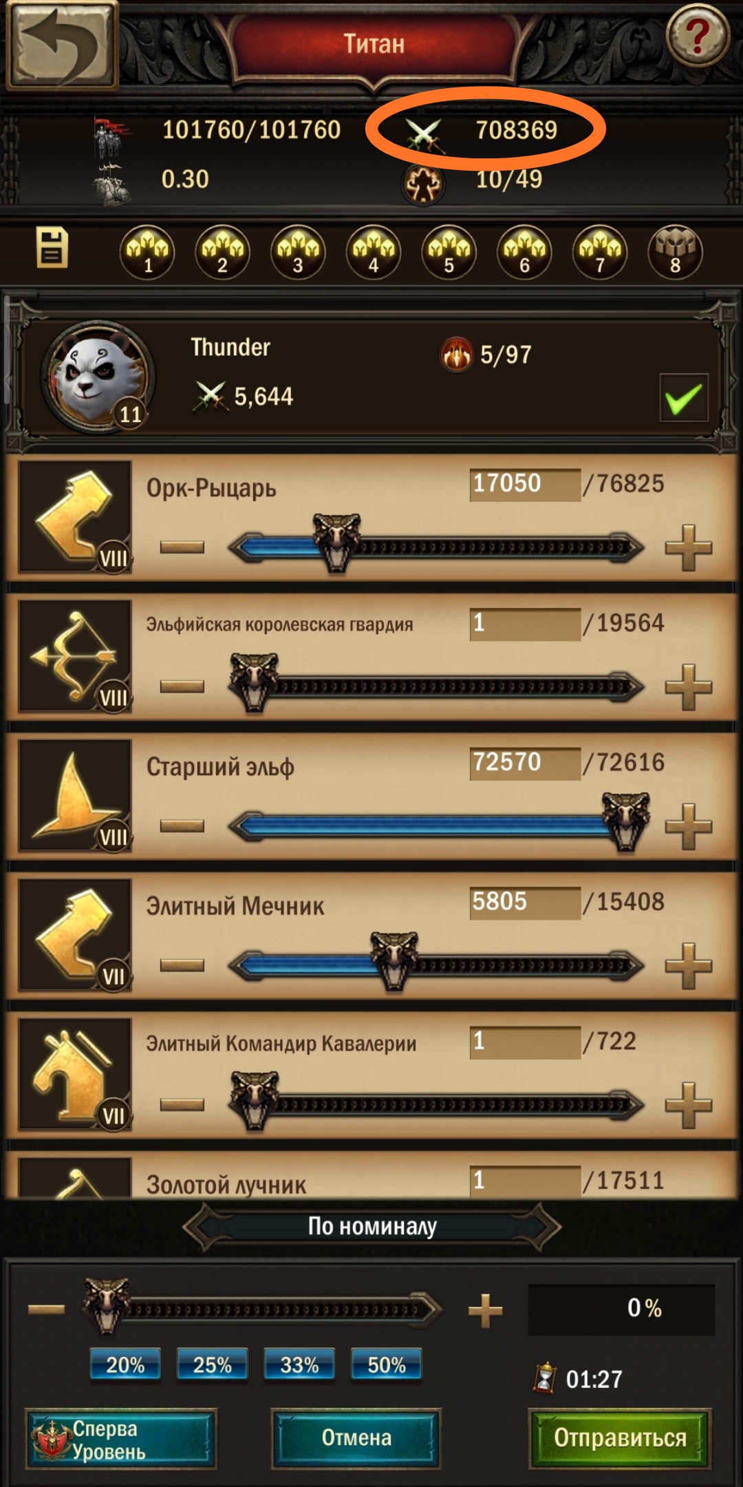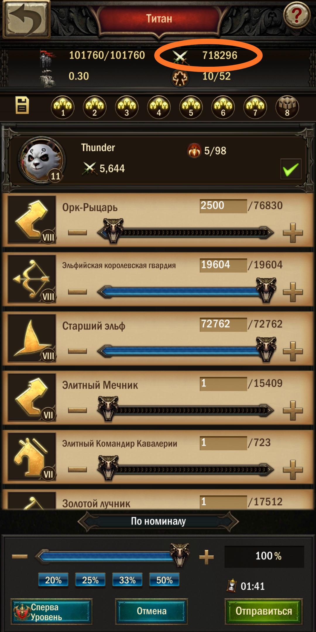 У меня основные маги т8, значит смещение построения делать не буду. Возьму всех ангелов, всех магов т8, всех луков т8. Добавлю пехоты, сколько влезет. Так вроде бы получается максимальная общая мощь (718к) отряда и собрана вся ударная сила — маги, луки, ангелы. Монстру остаётся 29%