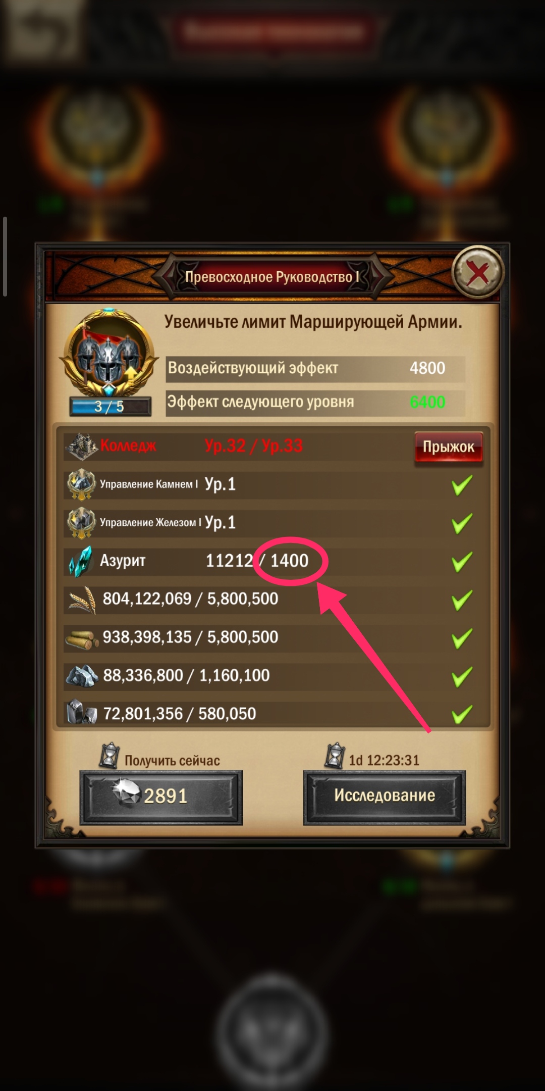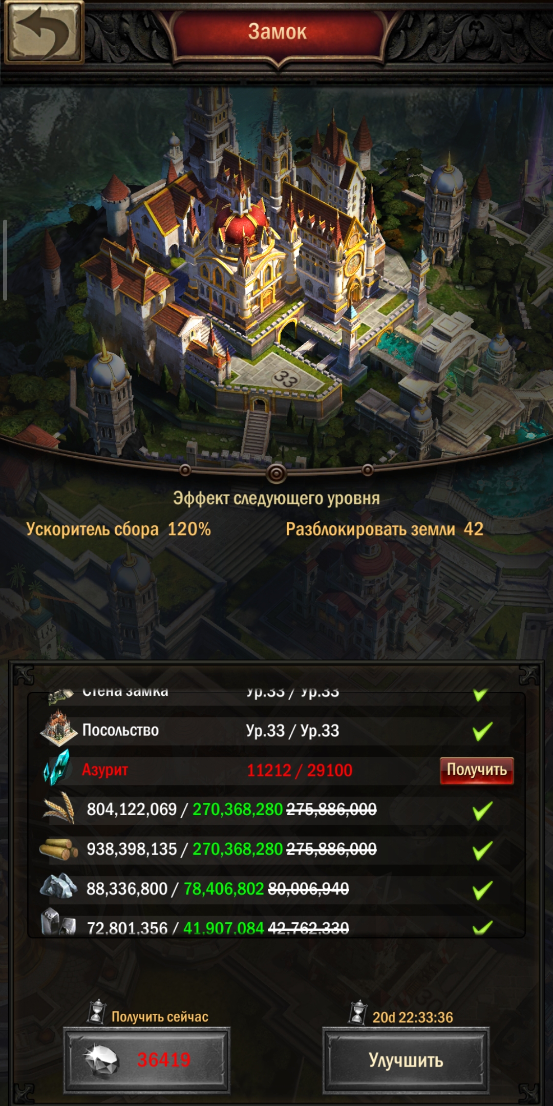 - На что влияет. Все постройки от 31 уровня и выше требуют азурита. И не только постройки, но даже и технологии. Требуется его очень много, а производится он в микроскопических количествах. Для полного понимания загляните в таблицы улучшения построек с31-с40. А я выложу здесь скрины, сколько его нужно на замок с34 и на какую-нибудь высшую технологию. С тех пор, как вы построили с30 каждый шаг дальнейшего развития будет длинною в месяцы, и почти перестанет зависеть от простых ресурсов. За это время все прочие замки до с29 при постоянном динамичном развитии смогут вас догнать по уровню.