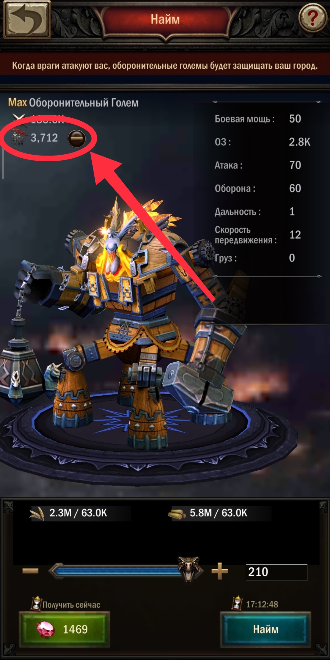 Для големов — всё тоже самое. Только зайти надо не в казарму, а в стену. Так же через кнопку «найм». Выбирать тип и тир не придётся — големы все одинаковые. Дальше знак «минус» рядом с количеством и…
