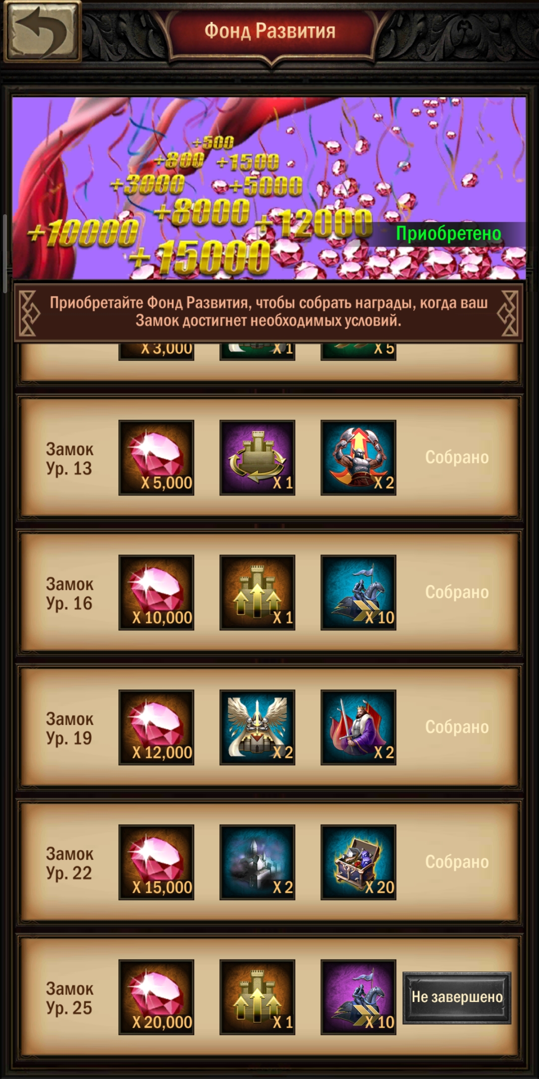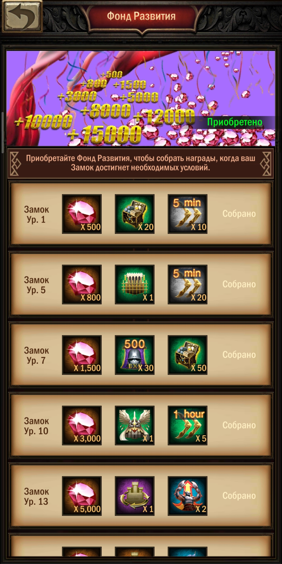 - «Фонд развития» — это такой «сертификат» длительного действия. Он будет подкреплять ваше развитие очень весомыми пакетами, до тех пор, пока вы не достигните с25. А по времени он действует бессрочно. При относительно небольшой цене. Предложение о его покупке действует всего три дня с момента создания нового замка. Затем оно пропадает и не появляется больше никогда. Рекомендую к обязательному приобретению!
