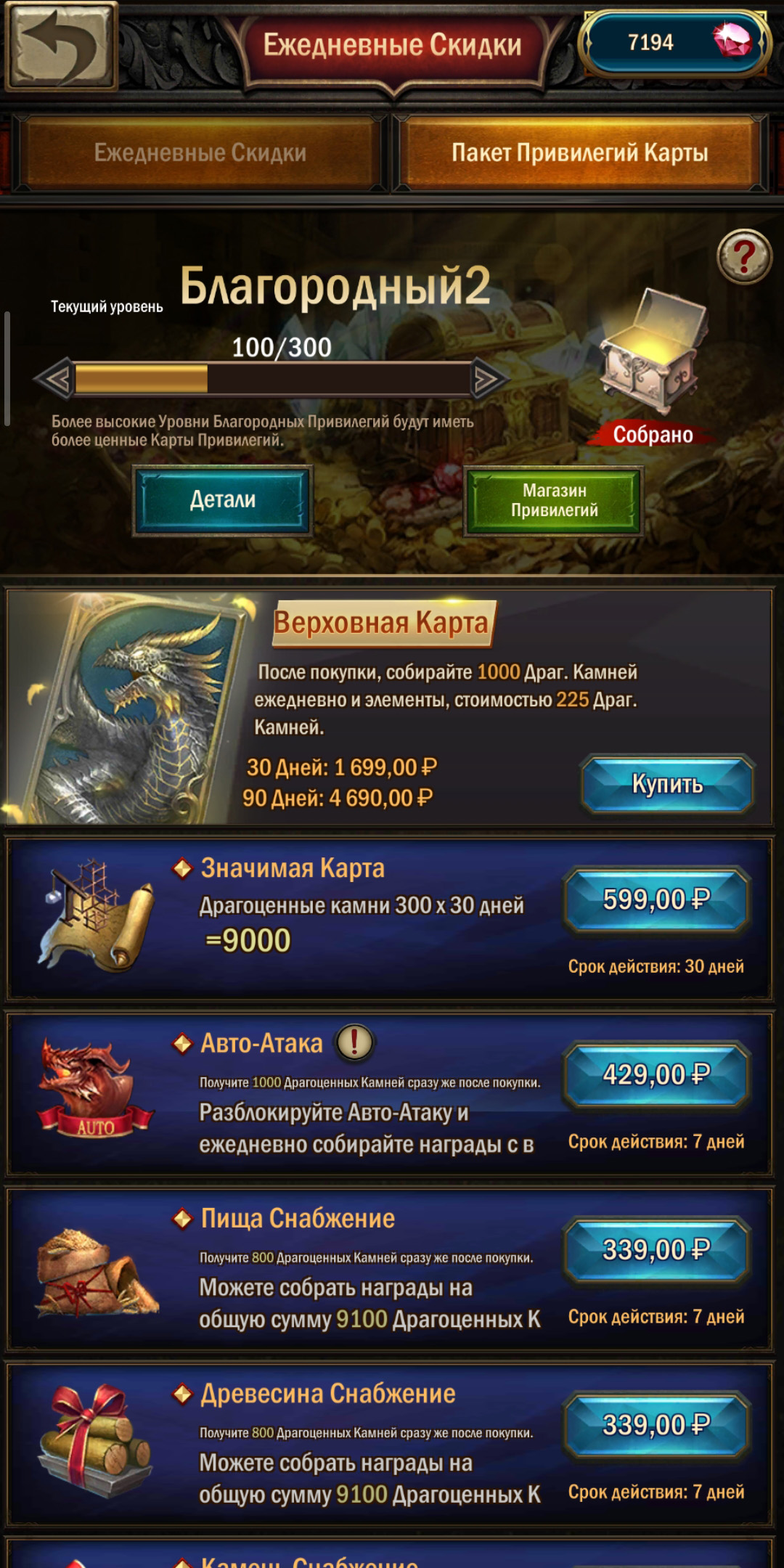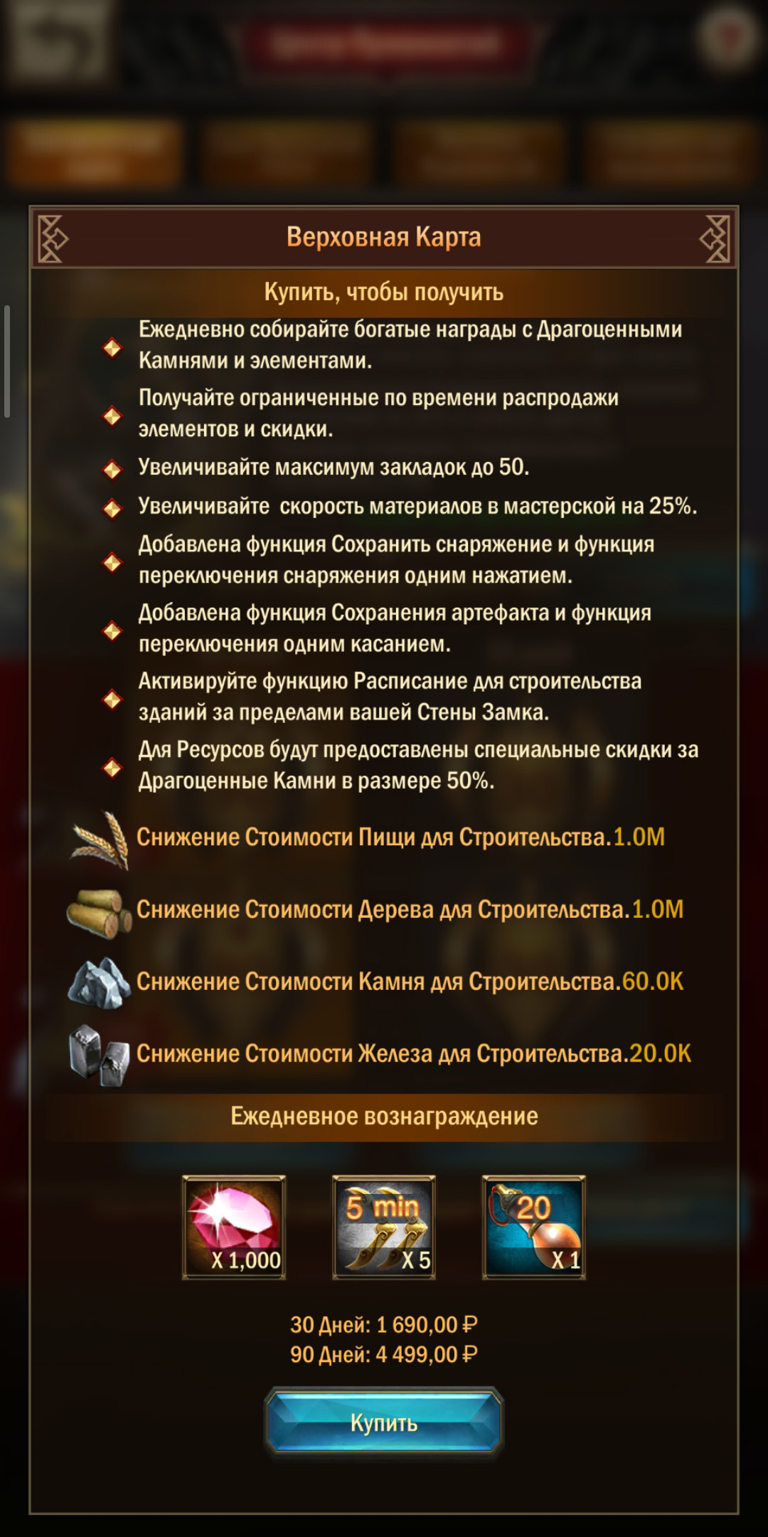 - Верховная карта привилегий — абонемент на месяц. • В течение 30 дней вы будете получать по 1000 алмазов ежедневно, получите дополнительные призы и скидки на другие покупки. • У вас появится возможность создавать автоматическое расписание/очередь строительства (для построек за стеной замка). Особенно актуально в начале игры, когда всё строится за 1-3 часа, и надо постоянно находится в игре, чтобы молоты не простаивали без дела. • Вы получите существенную скидку на строительство — размер скидки будет эквивалентен 1М по каждому ресурсу. • Увеличенное количество закладок, чтобы было удобнее следить за объектами на карте. • Увеличение скорости производства материалов для шмота в Мастерской. Рекомендую к обязательному приобретению, хотя бы первые два месяца игры.