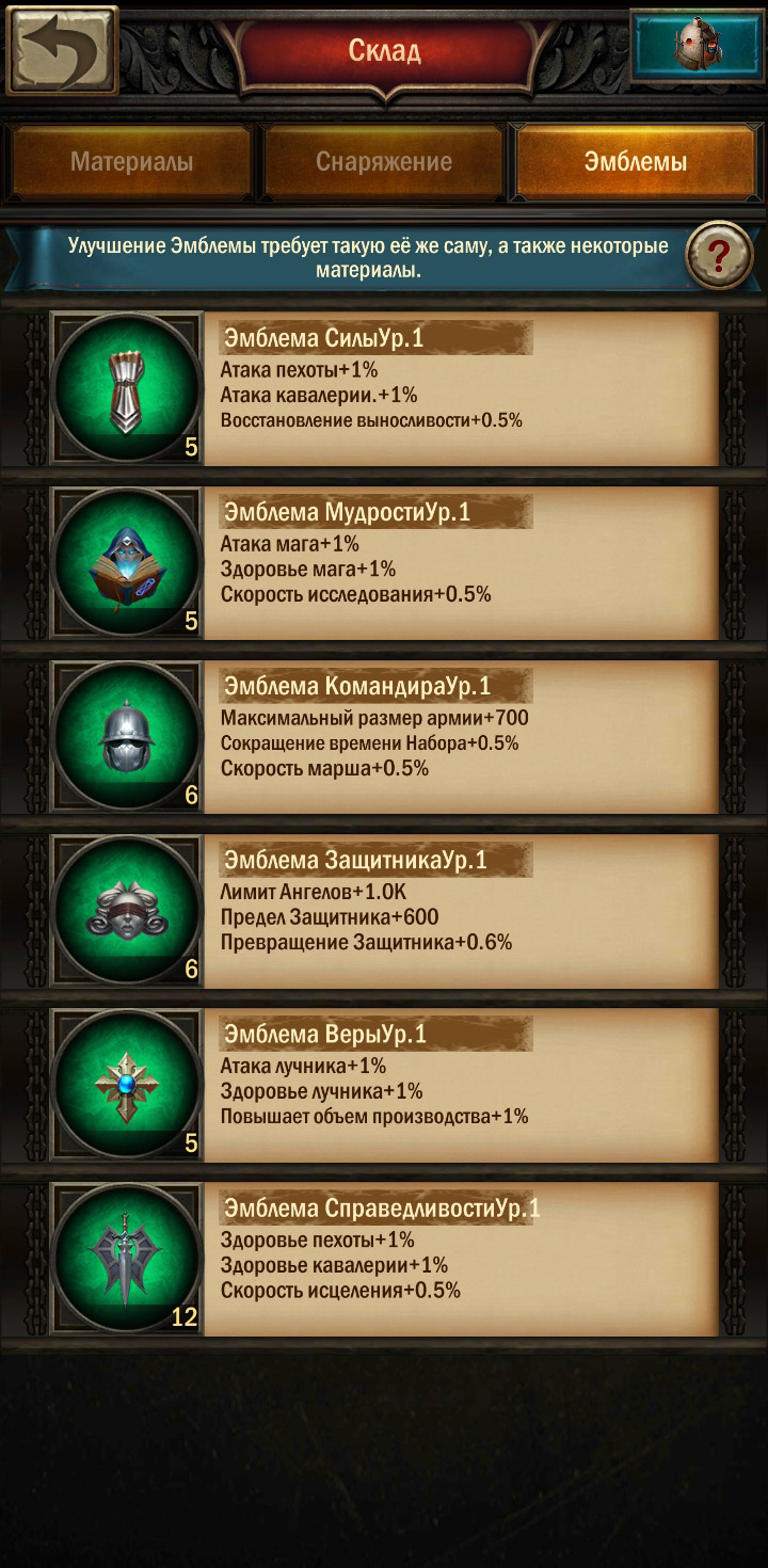 Эмблем всего 6, каждая из них имеет свой набор повышающих характеристик. Они участвуют в решении таких важных вопросах: как увеличить Силу Атаки или как расширить размера Марша