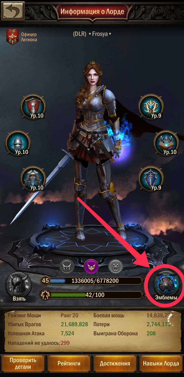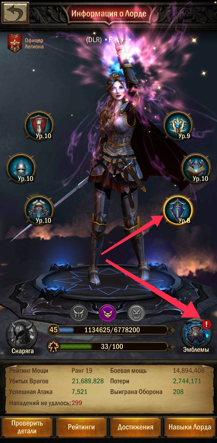 Эмблемы — это дополнительная разновидность снаряжения. Их можно посмотреть там же, где и шмот: в информации о Лорде (правый нижний угол), и в Кузнице/Склад/Эмблемы.
