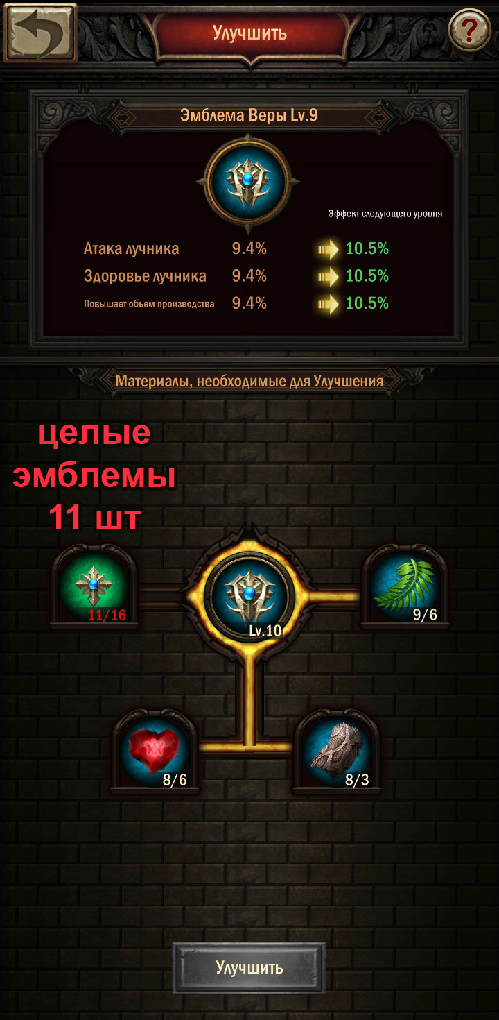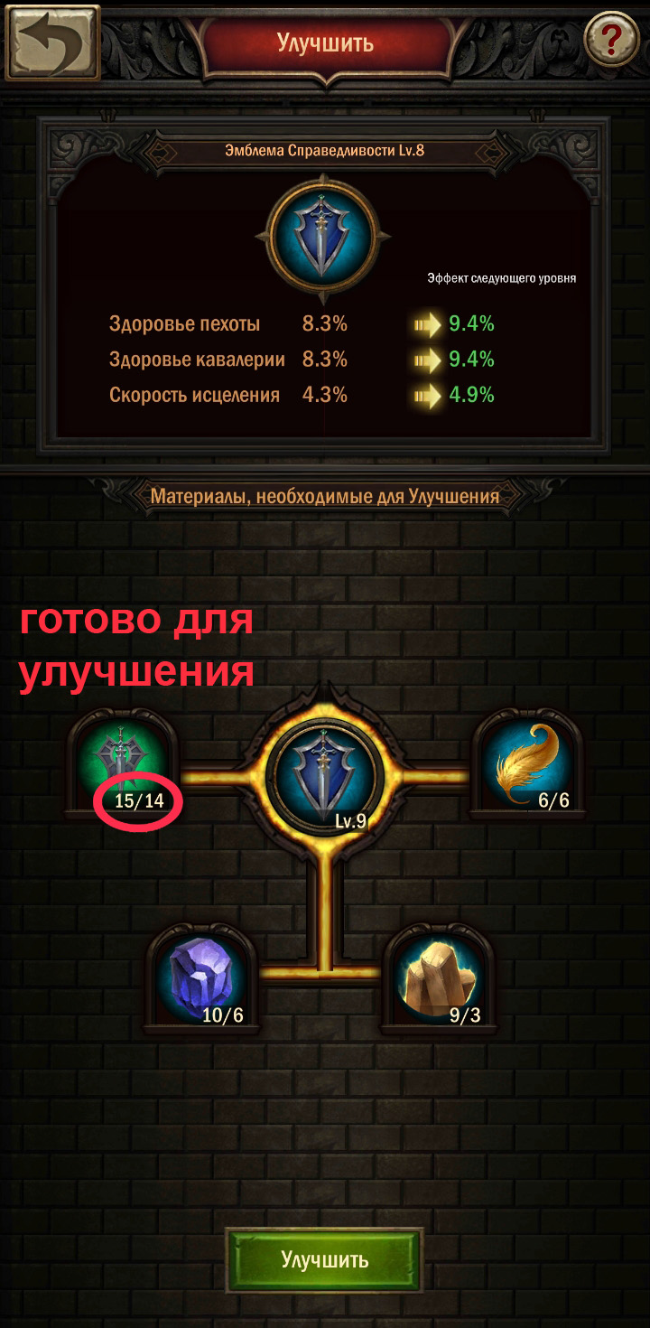 - Чем выше уровень эмблемы, тем больше эмблемок и материалов надо для её прокачки.