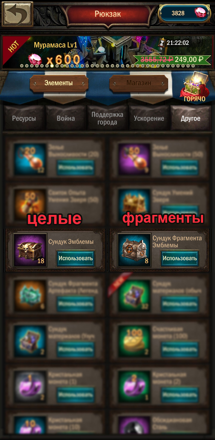 — Есть фрагменты, а есть целые эмблемы. Целая эмблема состоит из 50 фрагментов. Они выпадают из разных сундуков. А извлечённые из сундуков хранятся в разных местах: фрагменты в рюкзаке, а целые эмблемы автоматически копятся на странице улучшения самих эмблем. Поэтому чтобы улучшить эмблему до 6го уровня потребуется 6 таких же целых эмблем, или аж 6×50= 300 фрагментов