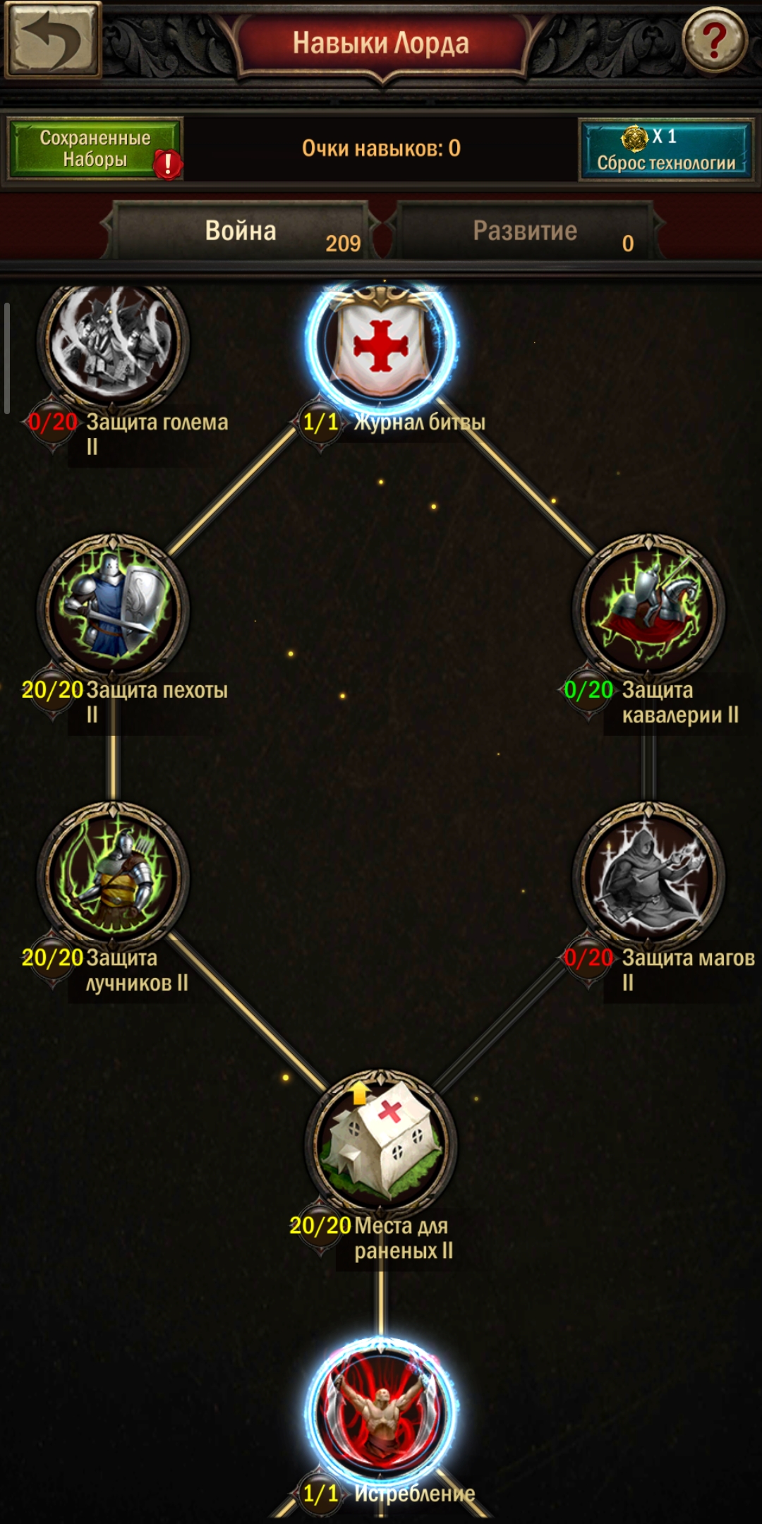 Если вы пошли по неверному пути, то это всегда можно исправить. Для изменения настроек Навыков Лорда предусмотрен элемент «Сброс Технологии» (продаётся у Купца). Или это можно сделать за 1000 алмазов. Кнопка находится в правом верхнем углу страницы настроек Навыков.