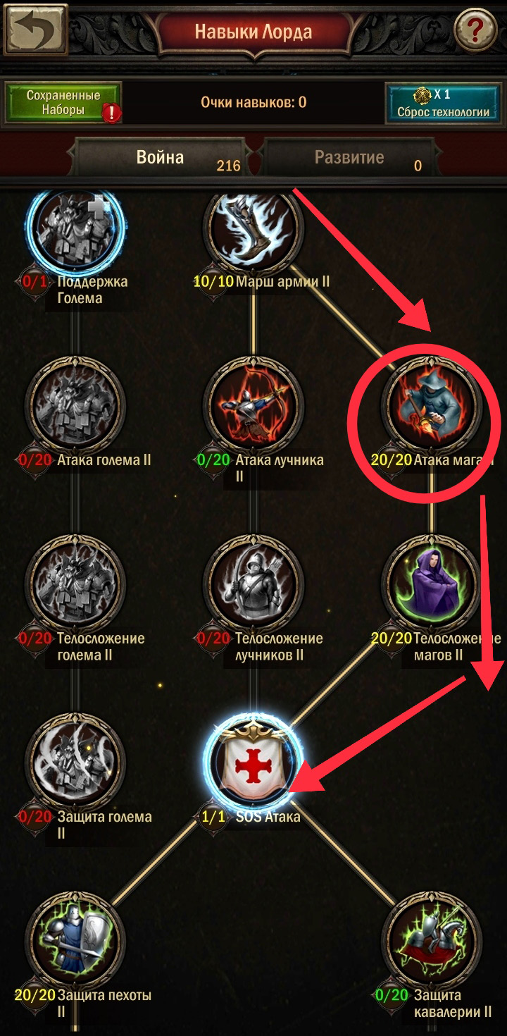- Навыки лорда. Стремясь как можно скорее добраться до активных Навыков Лорда, прокладывайте свой путь через максимально полезные пассивные навыки. Выбирайте те ветки развития, где будут прокачиваться характеристики нужных вам юнитов. То есть, например, та же атака мага.