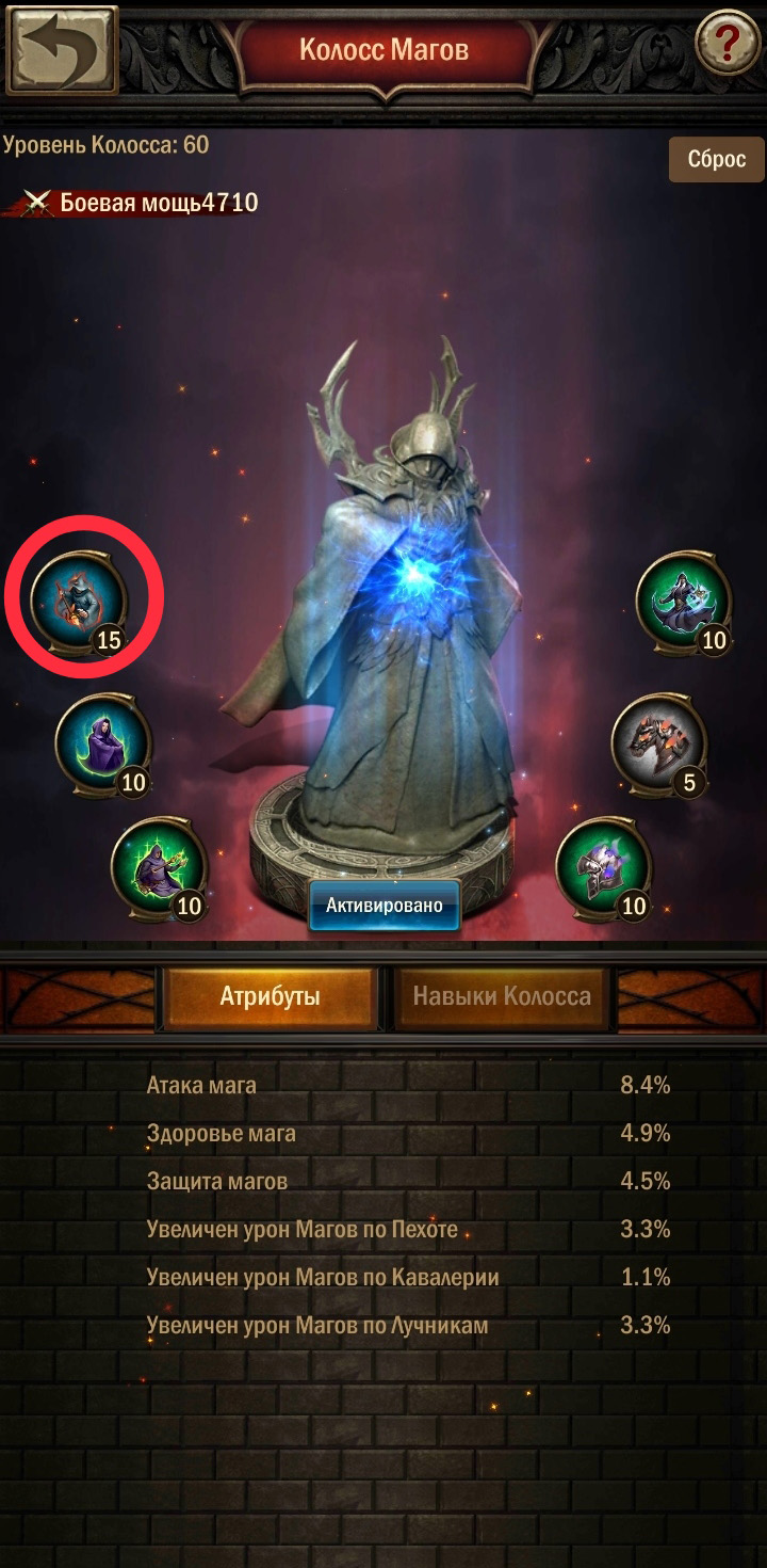 - Колосс. Сколько всего нового добавляют разработчики, чтобы нам не было скучно и чтобы мы постоянно и со всех сторон что-то прокачивали и развивали. Колосс создан именно для того, чтобы вы определились с основным боевым юнитом. Ведь колосс можно активировать только на один вид войск. Причём и среди прокачек одного юнита не стоит распыляться — выберите 2-3 универсальных (которые подойдут для любой атаки) направления и качайте только их. Например, зачем качать урон магов по кавалерии, когда вы не везде и не всегда сталкиваетесь с кавалерией во вражеской армии? В половине случаев этот навык не пригодится. Качайте лучше общую атаку мага — она пригодится везде и всегда.