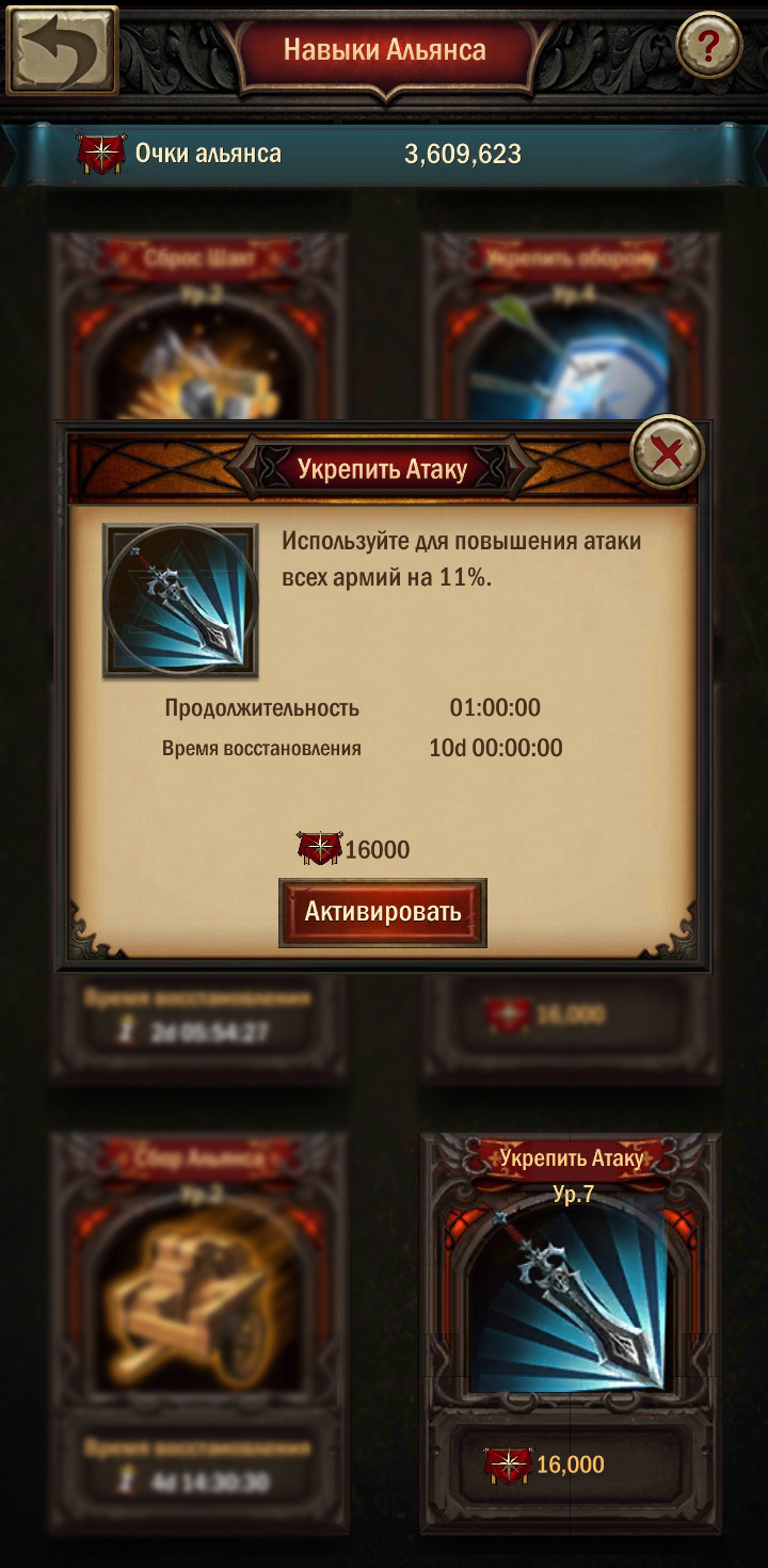 - Навыки Альянса / Технологии Храма. Перед (или прям во время) важной битвы или серии атак активируйте Навыки Альянса в Храме альянса. Такие как «Укрепить атаку», «Укрепить оборону», «Укрепить Здоровье». Это даст нужный эффект всего на 1 час, зато для всех участников альянса и для всех видов войск.