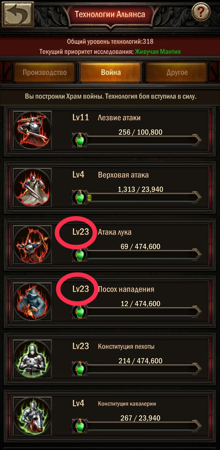 - Технологии альянса. Про необходимость жертвовать в Технологии Альянса я уже писала. Так вы увеличиваете боевые характеристики не только себе, но и помогаете стать сильнее своим соклановцам. Качайте Силу атаки и магам и лукам по очереди, если внутри альянса у вас есть и такие и такие игроки.