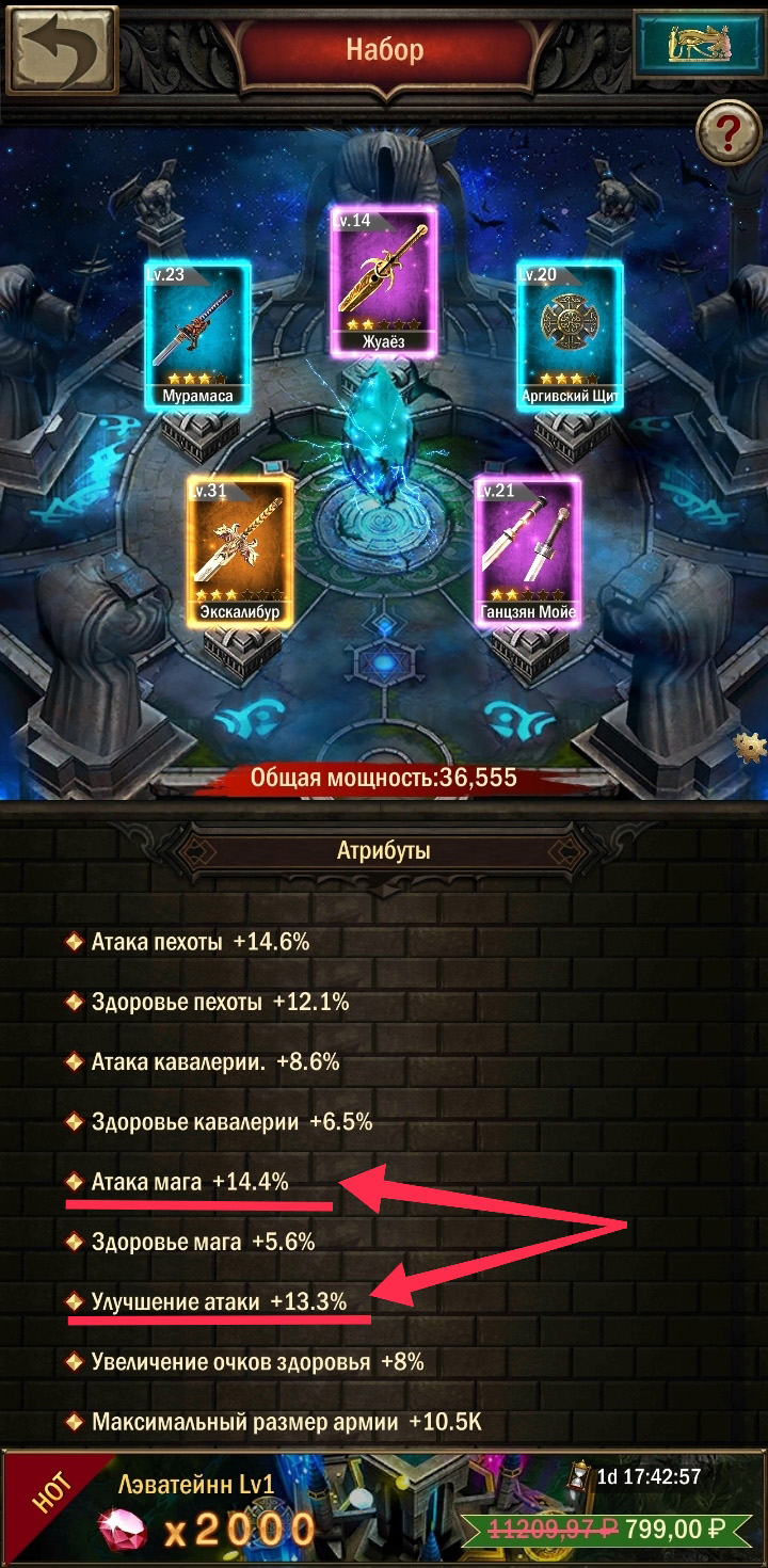 - Артефакты. Главный артефакт увеличения силы атаки — это Эскалибур. Это баф для всех видов войск одновременно. Основной артефакт для магов — Мурмасса, для луков — Чу-ко-Ну