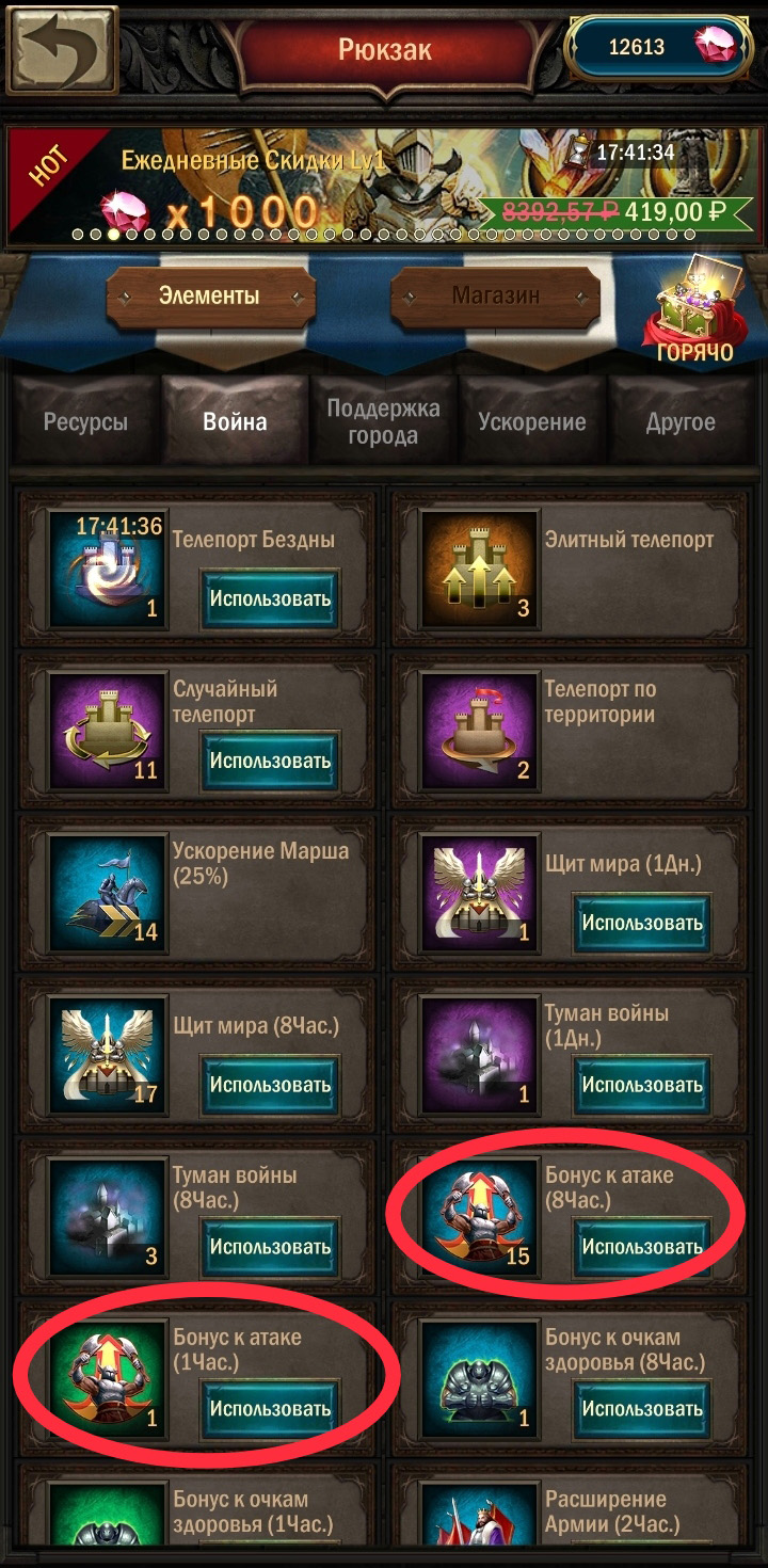 - Элемент «Бонус к Атаке». Добавляет 15% к силе атаки. Его еще называют баф или буст. У него есть брат-двойняшка «Бонус к очкам здоровья». Их можно купить в магазине альянса за Честь Альянса — на 1 час. В магазине в рюкзаке за алмазы — на 8 часов или сутки. Они выпадают как награды во время некоторых этапов «Самый сильный господин». Так же существуют их более крутые модификации «Улучшенный бонус атаки» — добавляет аж 25% к силе. Встречается чаще всего в пакетах за донат.