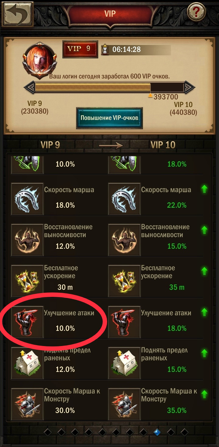 - VIP-8 и выше. Начиная от 8 уровня, у ВИПа добавляется опция «улучшение атаки». Чем выше уровень випа, тем больше он прибавляет к силе атаки — от 5% до 26%