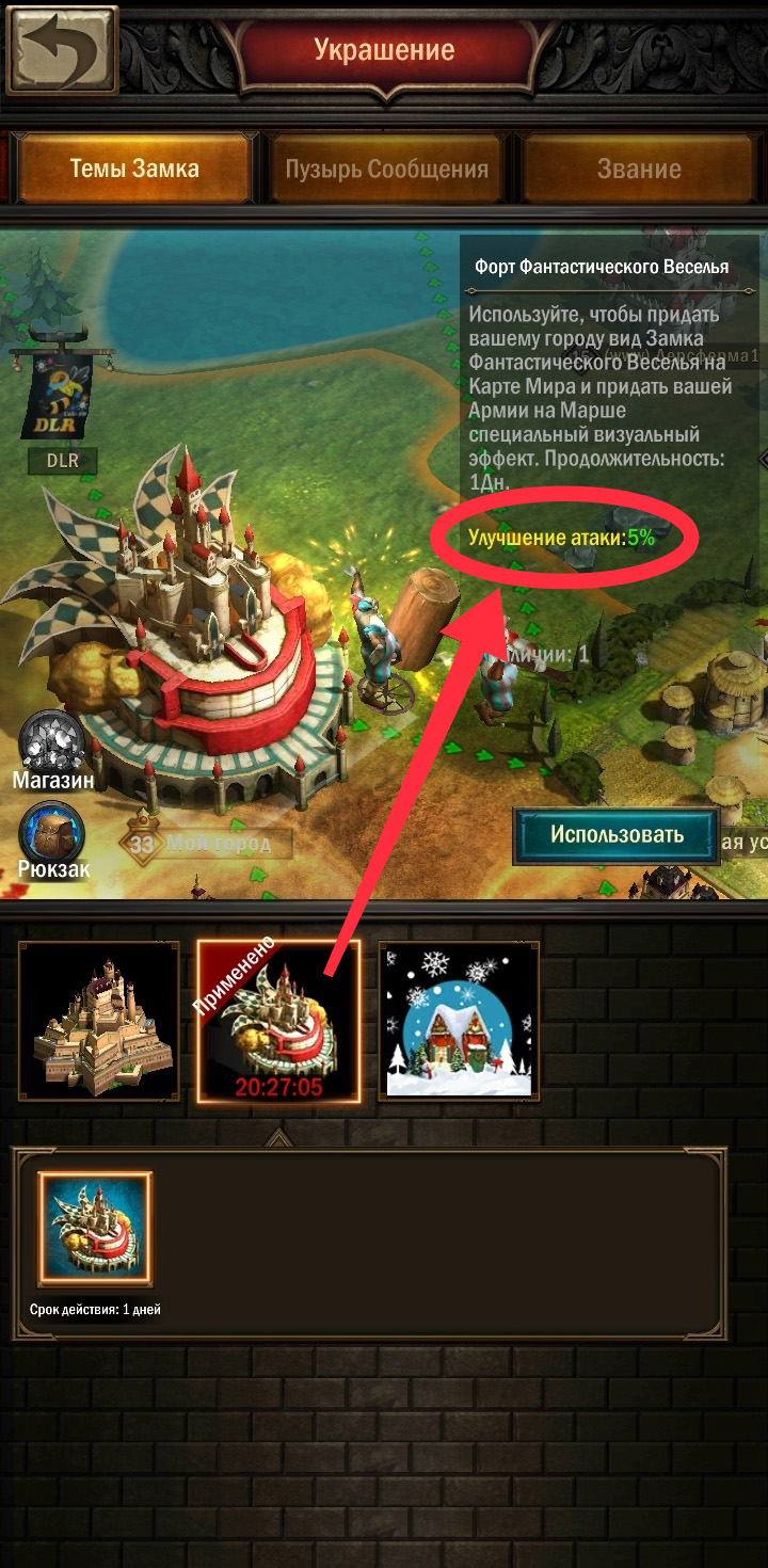 - Скин замка. На возможности этой штуковины мало кто обращал внимание… А ведь она создана не просто для устрашения или визуальной маскировки уровня замка. Она прибавляет целых 5% к атаке всех видов войск. Это весьма ощутимо!