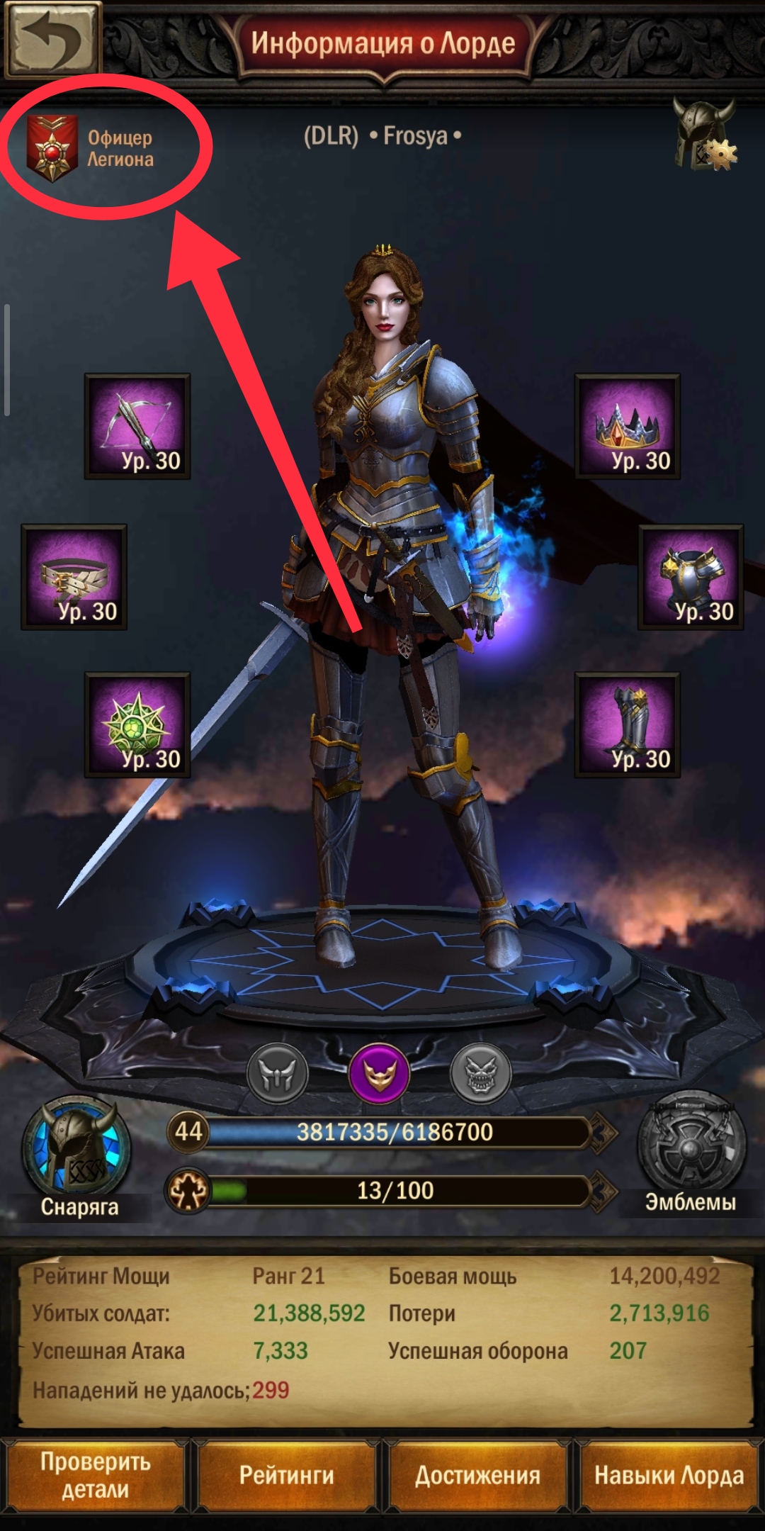 Посмотреть это можно зайдя в нижнем меню «Информация о Лорде». Там же, где вы видите и переключаете шмот. В верхнем левом углу такие красные погоны. Вы увидите: